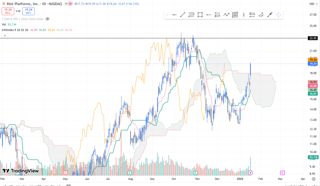 All indicators from the Ichimoku Cloud suggest that RIOT is moving very bullish right now, although it might be best to wait for a pullback before the entry.